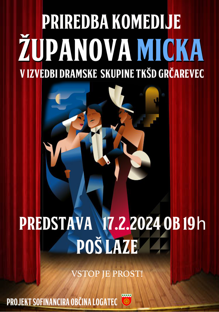 Krajevna skupnost Laze – Jakovica vas vabi na predstavo Županova Micka, ki bo v soboto, 17. februarja ob 19.00 v šolski telovadnici. Vstop je prost.